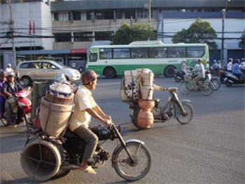 “Mưu sinh dọc đường về quê không chỉ vất vả mà nguy hiểm lắm. Vì đường sá đông đúc, xe cộ qua lại nườm nượp, mình lại chở cồng kềnh, lắm khi bị công an phạt hoặc bị va chạm thì coi như tiền thu vào không bằng tiền bỏ ra” – anh Dũng nói.