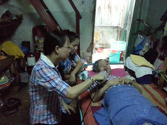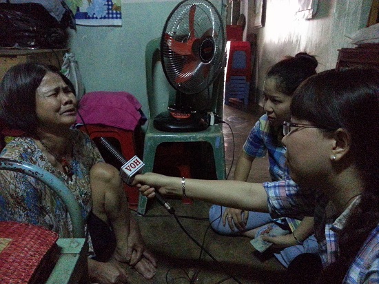 PV Hồng Thúy (bìa phải) và chị Bích Trâm đang thuyết phục cô Lừng nhận số tiền ủng hộ của thính giả.