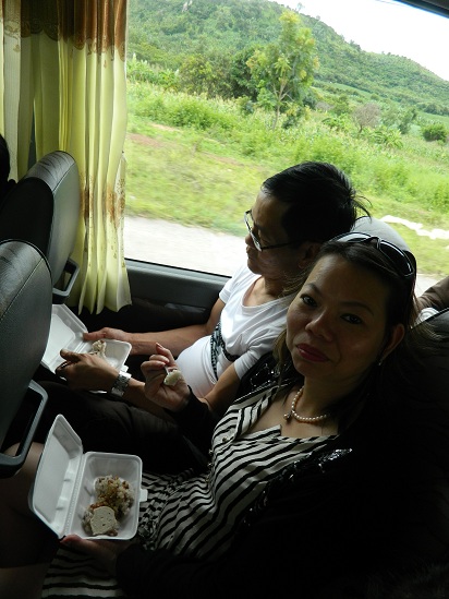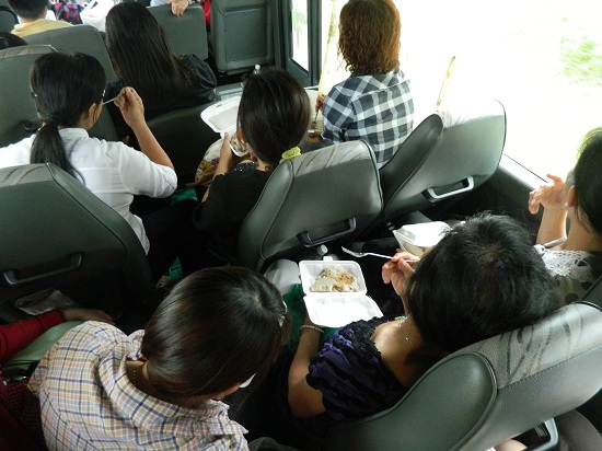 Khởi hành từ rất sớm và mọi người đã ăn bữa sáng ngay trên xe.