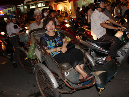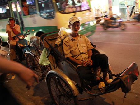 Ông lão tên là Trung Văn Lai, 72 tuổi, quê ở Mỹ Tho, Tiền Giang. Ngồi trên chiếc xe xích lô cũ kỹ, ông cụ dáng người còm cõi, mái tóc bạc phơ, làn da đen nhăn nhúm, miệng cười móm mém bảo: “Ông vẫn còn khỏe lắm. Đạp xe nhiều lúc cũng mệt, nhất là hôm nào đông khách đêm về chân lại nhức. Nhưng được cái trời thương cho ông sức khỏe, không bệnh tật gì cả”.