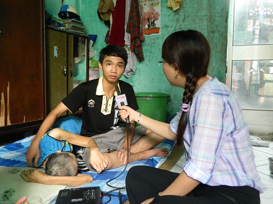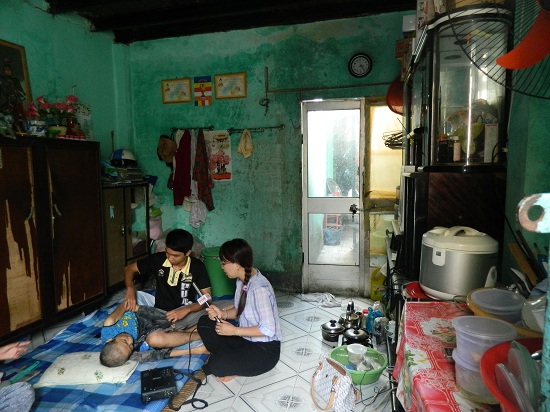 Phóng viên Hồng Thúy trò chuyện với hai mẹ con cô Dung.