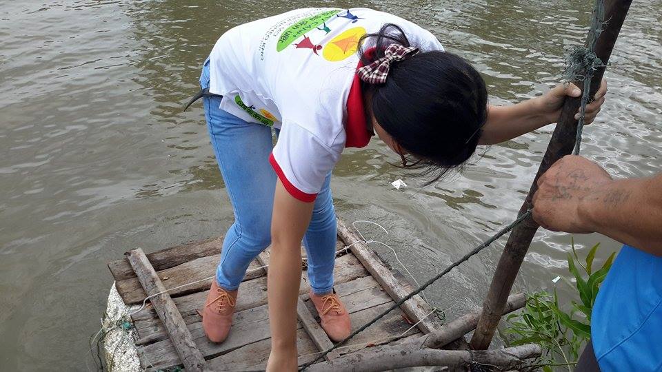 chân lên chiếc bè bằng xốp đơn sơ, kéo trên sợi dây cước nhỏ xíu,