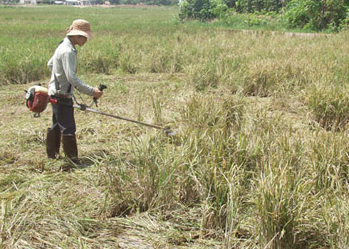 Nhiều đám ruộng trồng lúa PC10 bị lép hạt 100% nên thuê thợ dùng máy cắt cỏ xén bỏ. Ảnh: Quốc Dũng