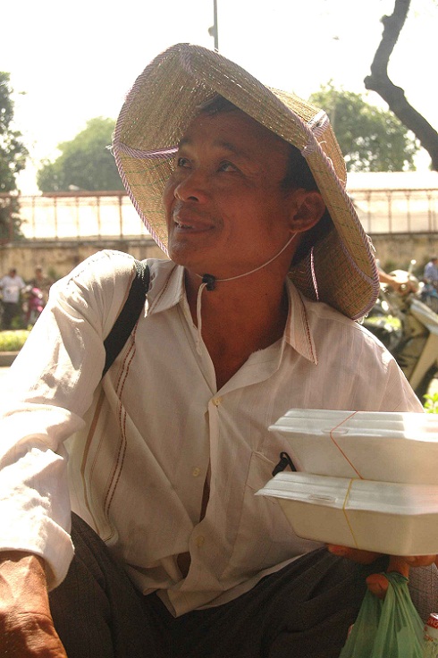 Ông Liều Nhữ Phát chờ con trai với hai hộp cơm chay xin được