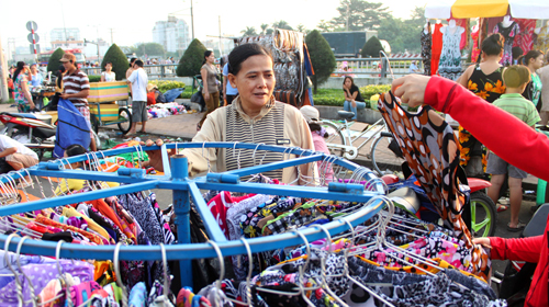 Người phụ nữ đó chính là dì Tám công nhân.“20 phút nữa dì phải có mặt ở hầm chui Tân Tạo để kịp soạn đồ, tranh thủ bán đến 6g30 phải dọn về để còn kịp vào công ty lên ca…” – dì Tám nói vội rồi leo lên xe. Sáng sớm trời còn se lạnh nhưng mồ hôi đã kịp rịn ra trên khuôn mặt hằn đầy nếp nhăn của dì. Dì sẽ bán tới lúc các con đường tràn ngập màu áo công nhân vào ca, dì mới thu dọn quần áo trở về phòng trọ. Đặt bao đồ xuống phòng, dì vội với tay đeo thẻ công nhân lên bộ đồng phục đã mặc sẵn rồi vụt chạy về phía cổng công ty…