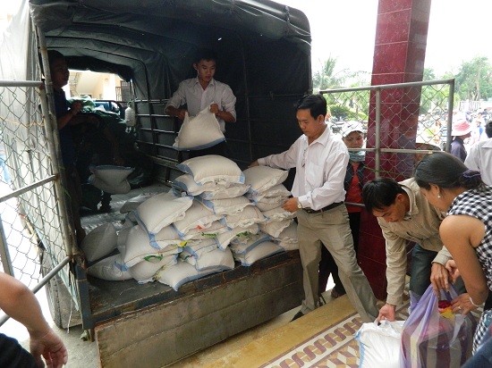 Kiểm tra chất lượng gạo trước khi trao cho bà con.